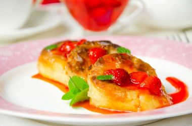 Оставшуюся клубнику режем на дольки и выкладываем сверху на сырники