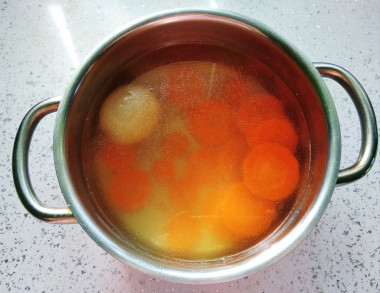 Варите косточку 15 минут на небольшом огне. Затем опустите в бульон луковицу и морковь. Дождитесь закипания и проварите бульон еще 5 минут. Затем закиньте в бульон куриное филе. Вновь дождитесь закипания, сделайте огонь минимальным.