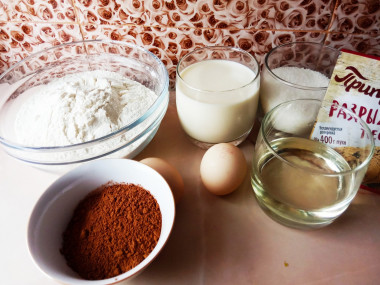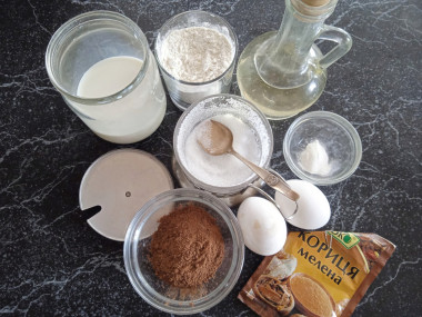Калорийность продуктов: Молоко, Сахар, Растительное масло, Пшеничная мука, Какао, Куриные яйца, Разрыхлитель, Корица, Яйца
