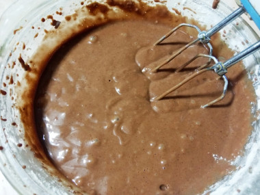 Добавить муку и разрахлитель, перемшать миксером. Готовое тесто по консистенции должно напоминать негустую сметану.