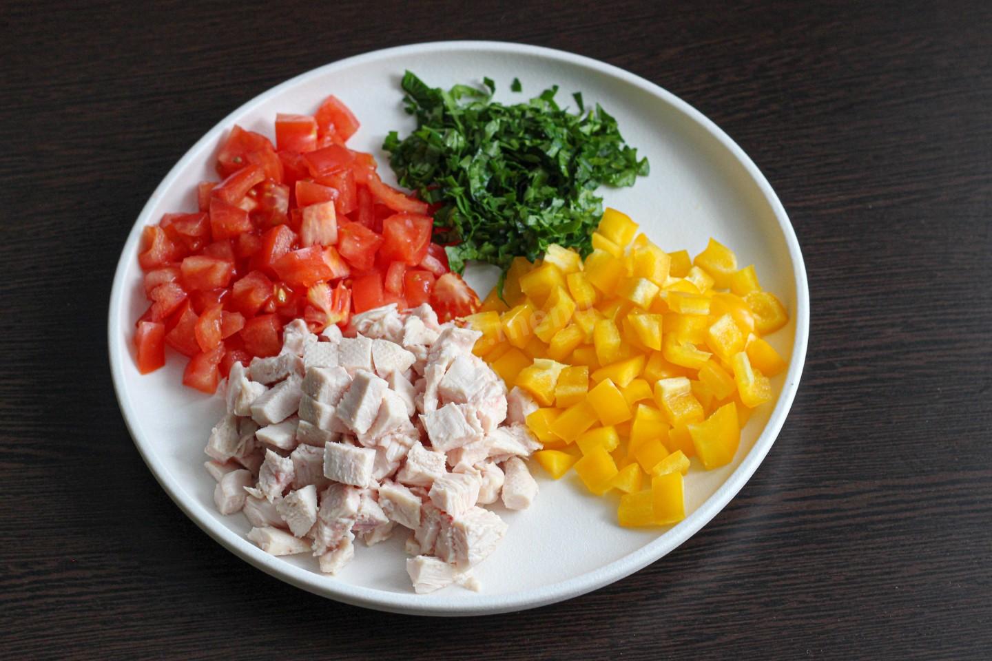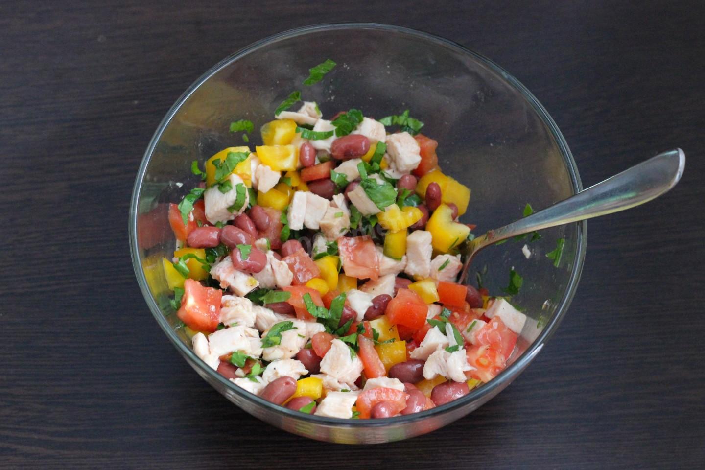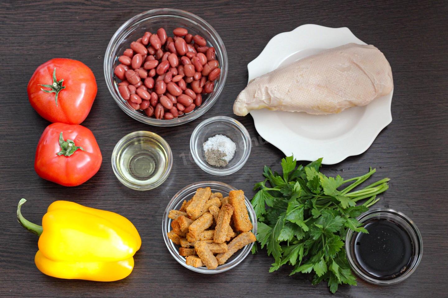 Шаг 1. Как сделать салат с кириешками, фасолью, помидорами и курицей?
