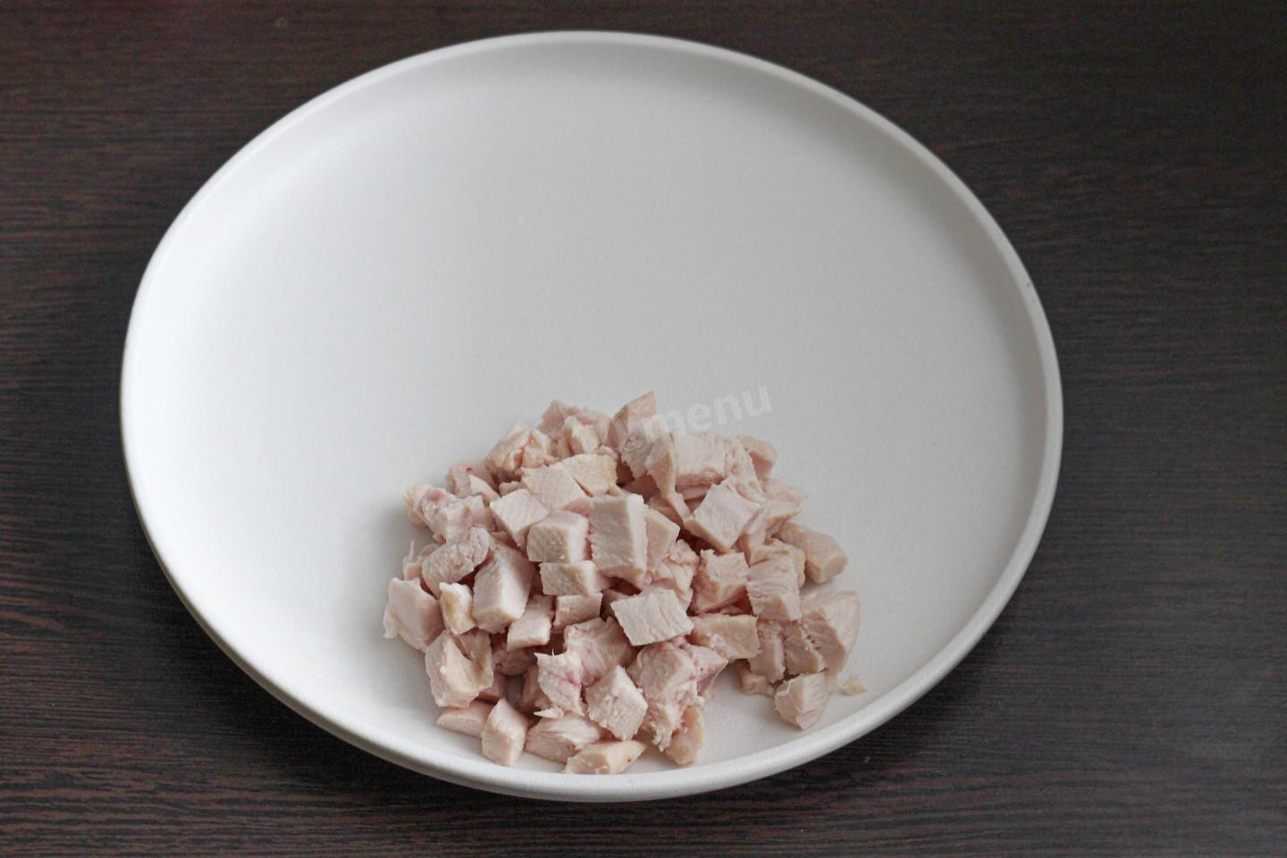 Куриное филе предварительно приготовьте. Подойдет отварное, запеченное или приготовленное сувид мясо. О том, как приготовить мясо каждым из этих способов, читайте в конце рецепта. Охлажденное куриное филе нарежьте на кубики среднего размера.