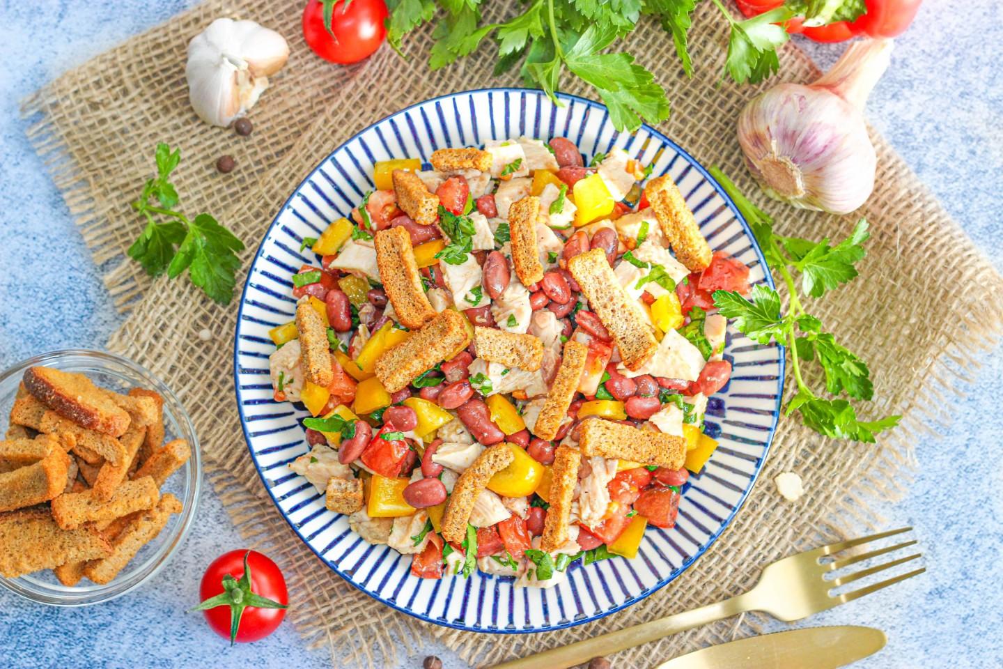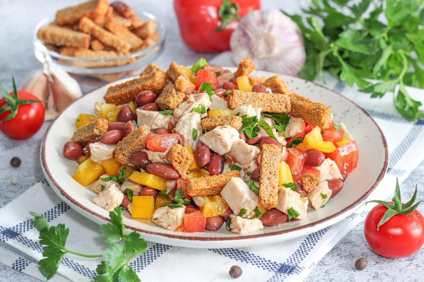 Этот салат с курицей и кириешками — источник качественного белка из куриного филе и фасоли, который необходим для мышц. Красная фасоль и свежие овощи (болгарский перец, помидоры) богаты клетчаткой, витаминами и антиоксидантами. Легкая заправка делает блюдо менее калорийным, а хрустящие сухарики дарят гастрономическое удовольствие.