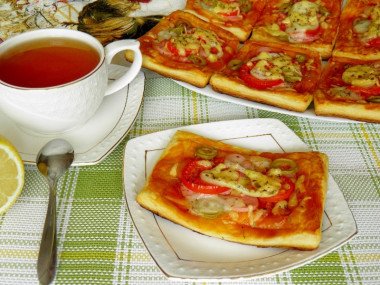 Слоеное тесто прекрасно подходит для пиццы. Как-то я заказывала на день рождение много мини пицц, но только их делали из большого куска теста, на который накладывали начинку, а затем сворачивали в рулет. Рулет нарезали кусочками и выпекали. Теперь сама так делаю, особенно, если нужно сделать много пицц.