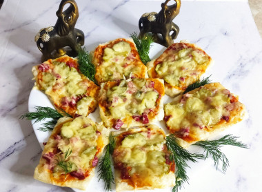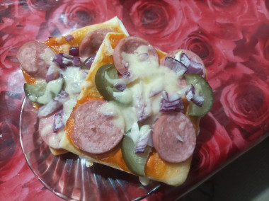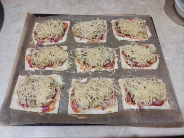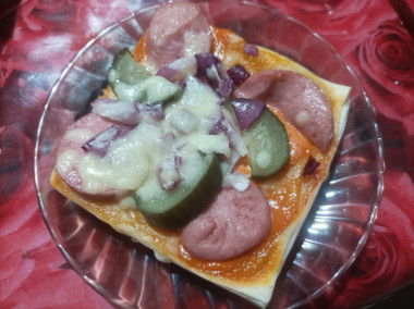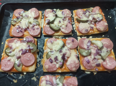 Очень понравилась мини пицца. Удобно делать на скорую руку, когда времени нет. И ингредиентов немного. Просто и доступно. Я брала замороженное слоеное тесто, пластами. Вместо сосисок положила шпикачки, они пожирнее и посочнее. Еще добавила мелко порезанный красный лук. Получилось обалденно! Вкусно!