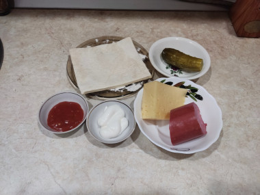 Как сделать мини пиццу из слоеного теста? Подготовьте ингредиенты. Слоёное тесто можно взять магазинное или приготовить самостоятельно. Рецепты теста можно посмотреть по ссылке внизу. При выборе слоёного теста отдайте предпочтение бездрожжевому. Сосиски выбирайте проверенные, с хорошим составом. Огурцы маринованные берите не кислые. Кетчуп и майонез можно заменить на свежие томаты. Рецепты соуса для пиццы можно посмотреть по ссылке внизу под шагами.