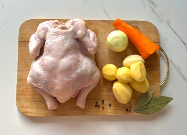 Бульон я люблю костный, поэтому покупаю цыпленка целиком – часть идет на суп, а другая остается на ужин. Провариваю мясо до такой степени, чтобы оно разделялось волокнами – так курочка получается очень нежная.
