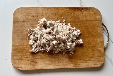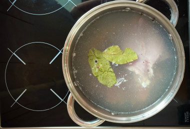 Первым делом варим бульон. Хорошо промываем курицу, заливаем холодной водой на 4-5 см выше курицы, солим и ставим вариться на средний огонь примерно на 1 час. Не забывайте тщательно снимать пенку. Когда кура будет готова, достаем ее из бульона и оставляем остывать.