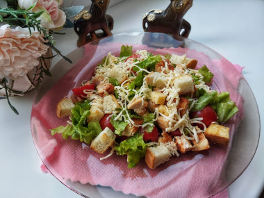Сынок приехал на выходные и приготовила любимое его блюдо: салат Цезарь с сыром,помидорами, курицей и сухариками. Готовится совсем просто,а результат ну очень вкусный!