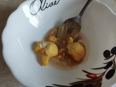 Куриные яйца отварите вкрутую. Я варила на всякий случай 2. Залейте яйца в ковшике холодной водой, добавьте соль, накройте крышкой и поставьте ковшик на огонь. Как вода закипит, засеките 9 минут. После кипяток слейте и залейте яйца холодной водой, чтобы они легче очистились от скорлупы. Яйцо очистите. Белок нам не нужен, а вареный желток мы возьмем для соуса.