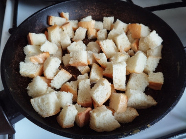 Нарежьте хлеб кубиками, сбрызните их совсем чуть-чуть растительным маслом, посыпьте специями и перемешайте. Пересыпьте сухарики на горячую сковороду и обжаривайте минут 3-5, помешивая. Следите, чтобы сухарики подсушились и слегка покрылись румяной корочкой.