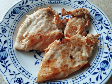 Переложите жареное куриное филе на салфетку остыть, посолите. Мясо очень сочное, почти не теряет в весе при таком способе обжарки. И, что самое главное, оно без жира.