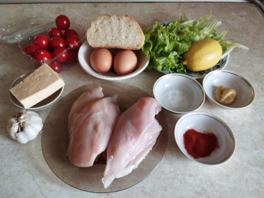 Как сделать салат Цезарь с помидорами, курицей и сухариками? Подготовьте все продукты по списку. Вымойте овощи, яйца, лимон. И обсушите их салфетками. Куриное филе очистите от пленок, вымойте и обсушите. Пармезан при необходимости можете заменить любым другим твердым сыром. Помидоры берите мелкие, но лучше черри.
