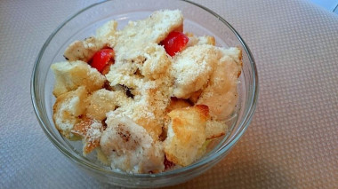Полейте все соусом и добавьте сухарики.