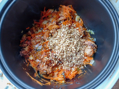 Добавить крупу и рыбу к обжаренным овощам. Посолить, поперчить. Долить воды.