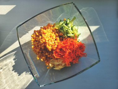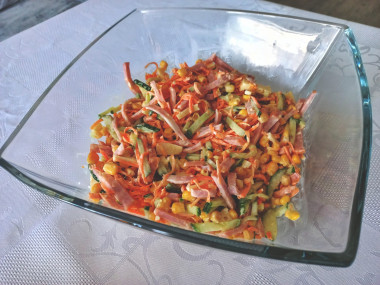 Сделать его можно буквально за несколько минут. Нужно лишь нарезать колбасу, сыр, огурец, добавить кукурузу и уже готовую корейскую морковь, заправить майонезом. Для большей эстетики можно выложить ингредиенты слоями, как это сделал автор рецепта, но я решила всё перемешать.