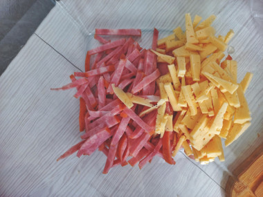 Колбасу нарежьте тонкими кружочками, а затем кубиками.