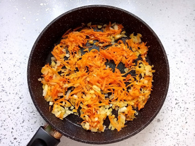 Лук и морковку нарежьте небольшими фрагментами как вам более привычно. В сковороде разогрейте небольшое количество растительного масла. Отправьте лук с морковкой в сковородку.