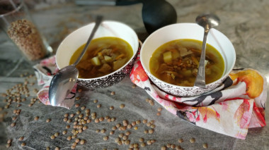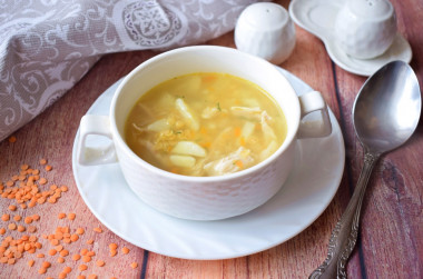Я нечасто готовлю блюда с чечевицей. Но тут, увидев её на полке в магазине, почему-то захотелось купить. А дома я нашла рецепт, в котором смогу её использовать - суп из чечевицы с курицей.