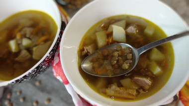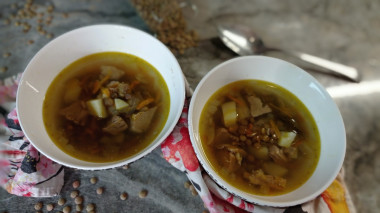 У меня был готовый свиной бульон, на неём и сварила суп. Чечевицу купила зеленую, согласно инструкции на упаковке её надо варить 40 минут. Поэтому сначала я отдельно отварила чечевицу в течение 25 минут, потом добавила её в суп и оставила вариться ещё 15 минут. Помидоры не стала добавлять в зажарку, поскольку мои дети не очень любят помидоры в супах.