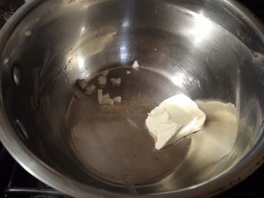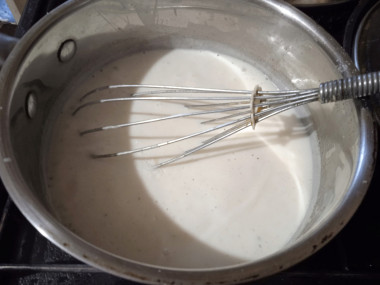 Сделала сливочный соус для пиццы по этому рецепту. В сотейнике растопила сливочное масло с измельчённым чесноком. Аромат был потрясающий. Чеснок не вынимала, оставила в соусе. Мы любим чеснок в любом виде. Затем добавила муку и перемешала с маслом, получился комок. После частями вливала сливки и перемешивали венчиком, чтоб не было комков. Готовила на медленном огне при постоянном помешивании. Из специй добавила соль, перец и молотый мускатный орех. Соус довольно быстро загустел.