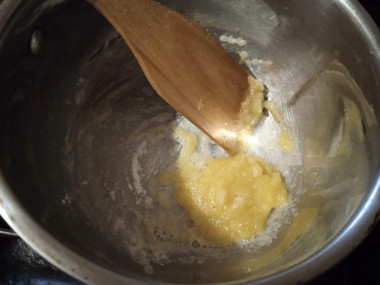 Всыпьте в сковороду муку и перемешайте до однородности.
