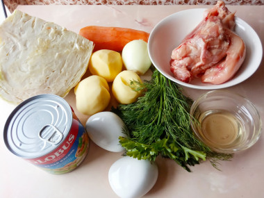 Морковку, картошку и лук очистите от кожуры. С капусты удалите внешние листы. Все овощи ополосните в чистой воде. Лук и морковку измельчите любым удобным для вас способом. Я лук нарезала мелкими кубиками, а морковку натёрла на тёрке с крупными зубками.
