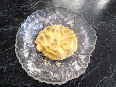 Берём форму посыпаем её не много мукой и выкладываем в неё большую часть тесто, сделав бортики. Ставим форму в холодильник на 20 минут.