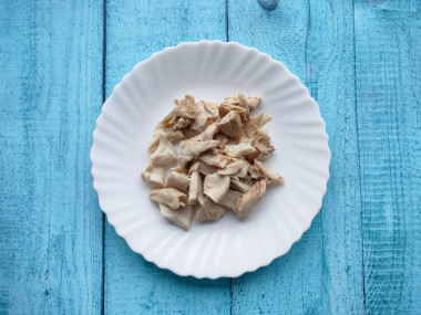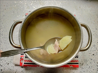 Курицу залейте холодной водой, доведите до кипения и проварите в течение 30 минут. При закипании будет образовываться пенка, которую необходимо снимать. Затем курицу извлеките из кастрюли, отделите мясо от костей (при необходимости немного нарежьте) и верните его обратно в процеженный бульон. Снова доведите все до кипения. Как выбрать кастрюлю для супа вы узнаете из статьи, ссылка есть в конце этого рецепта.