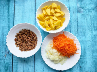 Очищенный картофель нарежьте небольшими кусочками. Гречку хорошо промойте несколько раз. Затем всю воду с неё слейте. Наличие в супе картофеля сделает его более питательным.