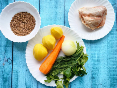 Как сварить гречневый суп с курицей? Подготовьте все необходимые ингредиенты. Для супа можно использовать любую часть курицы, у меня куриное филе. Картофель и морковь вымойте с щеткой под проточной водой, очистите и ополосните. Лук очистите от шелухи, ополосните. Как выбрать гречку можно узнать прочитав соответствующую статью. Ссылка есть в конце этого рецепта.