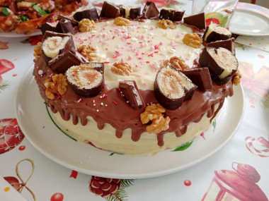 Крем сварила заранее, чтобы он успел охладиться и застыть. Такой крем действительно гораздо удобнее наносить на коржи. Сливочное масло я добавляла сразу в горячий крем и мешала венчиком до растворения. Потом накрыла пищевой пленкой в контакт и охладила. Торт собирался легко, не "плыл", верх и бока тоже обмазала кремом и убрала на ночь в холодильник. Для пропитки у меня был мятно-лимонный сироп, я его разбавила пополам водой. Утром украсила расплавленным шоколадом, поверх которого выложила кусочки рулетиков, шоколадки и грецкие орехи. Сверху еще кондитерскую посыпку добавила. В первые я увидела, что заварной крем держит шоколадные подтеки)
