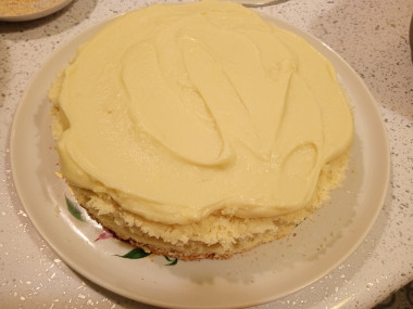 Таким образом соберите весь торт. Верх и бока торта также смажьте кремом. Уберите десерт в холодильник на 5-6 часов, чтобы он пропитался.