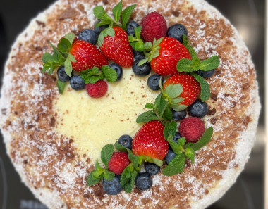 Перед подачей украсьте торт по желанию. Я присыпала бока торта тертым шоколадом и украсила ягодами и листиками мелиссы. Пергамент уберите, разрежьте десерт на порционные кусочки и подавайте к столу. Приятного аппетита!