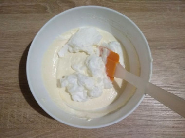 Затем добавьте белки и вмешайте их ложкой движениями сверху внизю. Делайте это аккуратно, чтобы не нарушить воздушность взбитых белков.