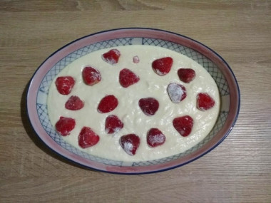 Клубнику нарежьте кусочками произвольной формы и выложите на тесто.