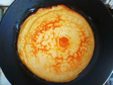 Возьмите сковороду подходящего размера. У меня с антипригарным покрытием. Разогрейте ее на небольшом огне. Смажьте дно небольшим количеством растительного масла. Налейте на сковороду тесто, разровняйте его при помощи лопатки. Накройте сковороду крышкой, сделайте огонь минимальным. Готовьте лепешку несколько минут, она должна немного подрумяниться снизу.