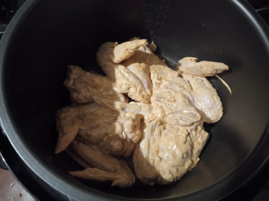 Промариновавшуюся курицу выкладываем в мультиварку. Обжариваем с обеих сторон.