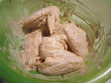 Моем курицу,обваливаем в маринаде, оставляем на 2 часа.