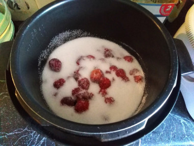 Помещаем ягоды в чашу мультиварки и засыпаем сахарным песком. Включаем режим Подогрев на 30 минут.