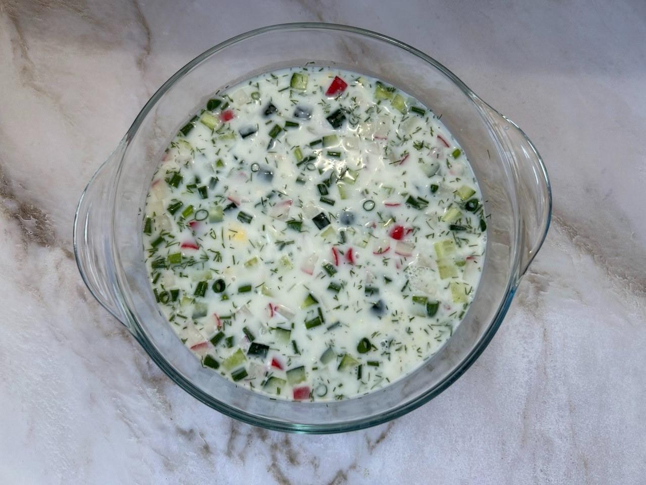 Залейте кефирной смесью окрошку и перемешайте. Подавайте охлажденной. Приятного аппетита!