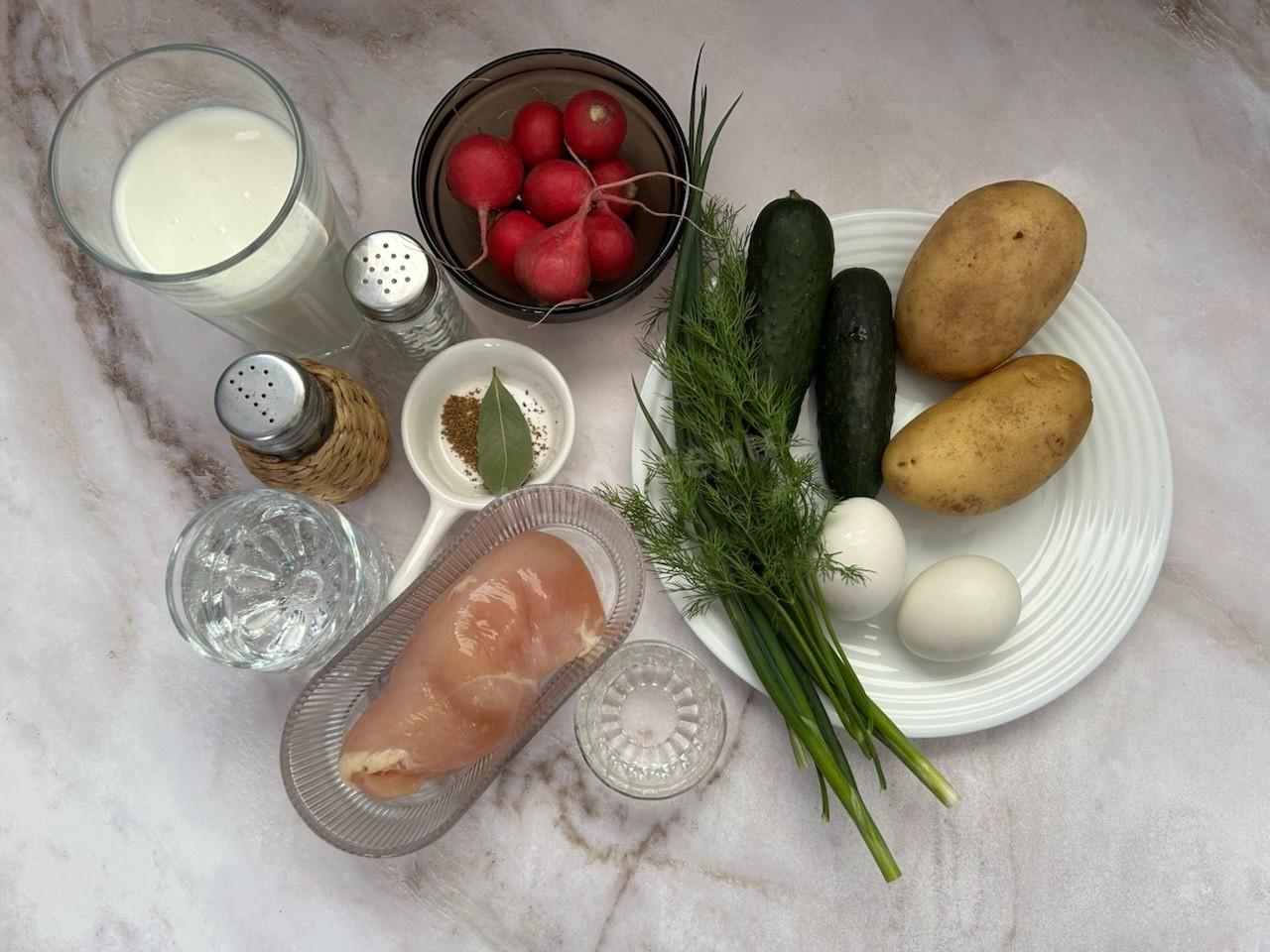 Как сделать вкусную окрошку с курицей на кефире? Для начала подготовьте все необходимые ингредиенты по списку. Курицу лучше использовать свежую, но если у вас только замороженная, то предварительно разморозьте её. Как правильно это сделать читайте в конце рецепта.