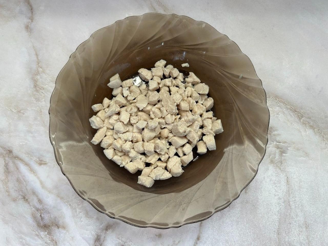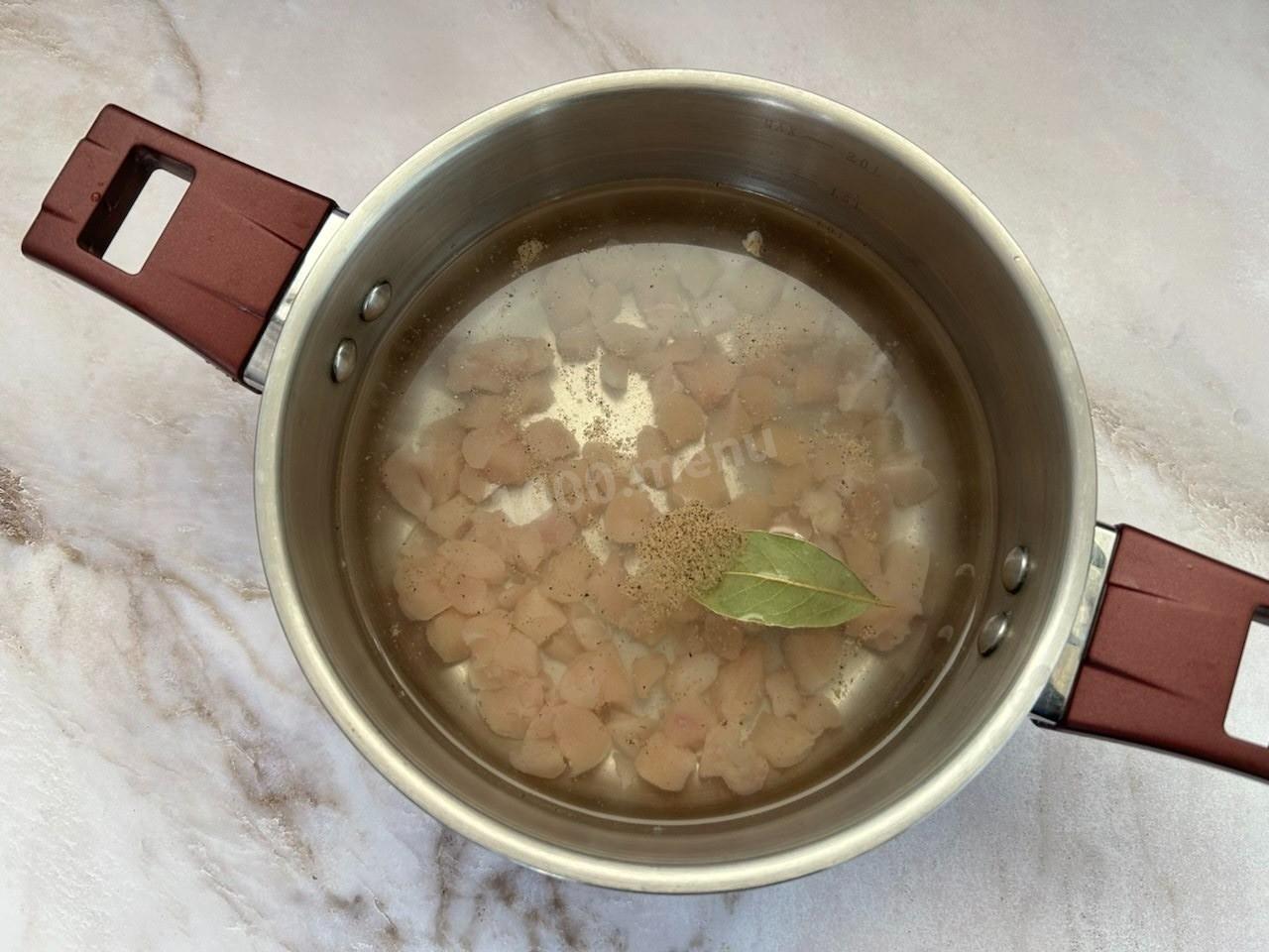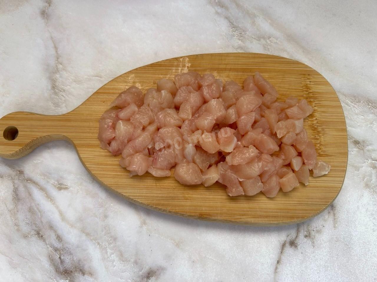 Куриную грудку промойте и нарежьте мелкими кубиками.