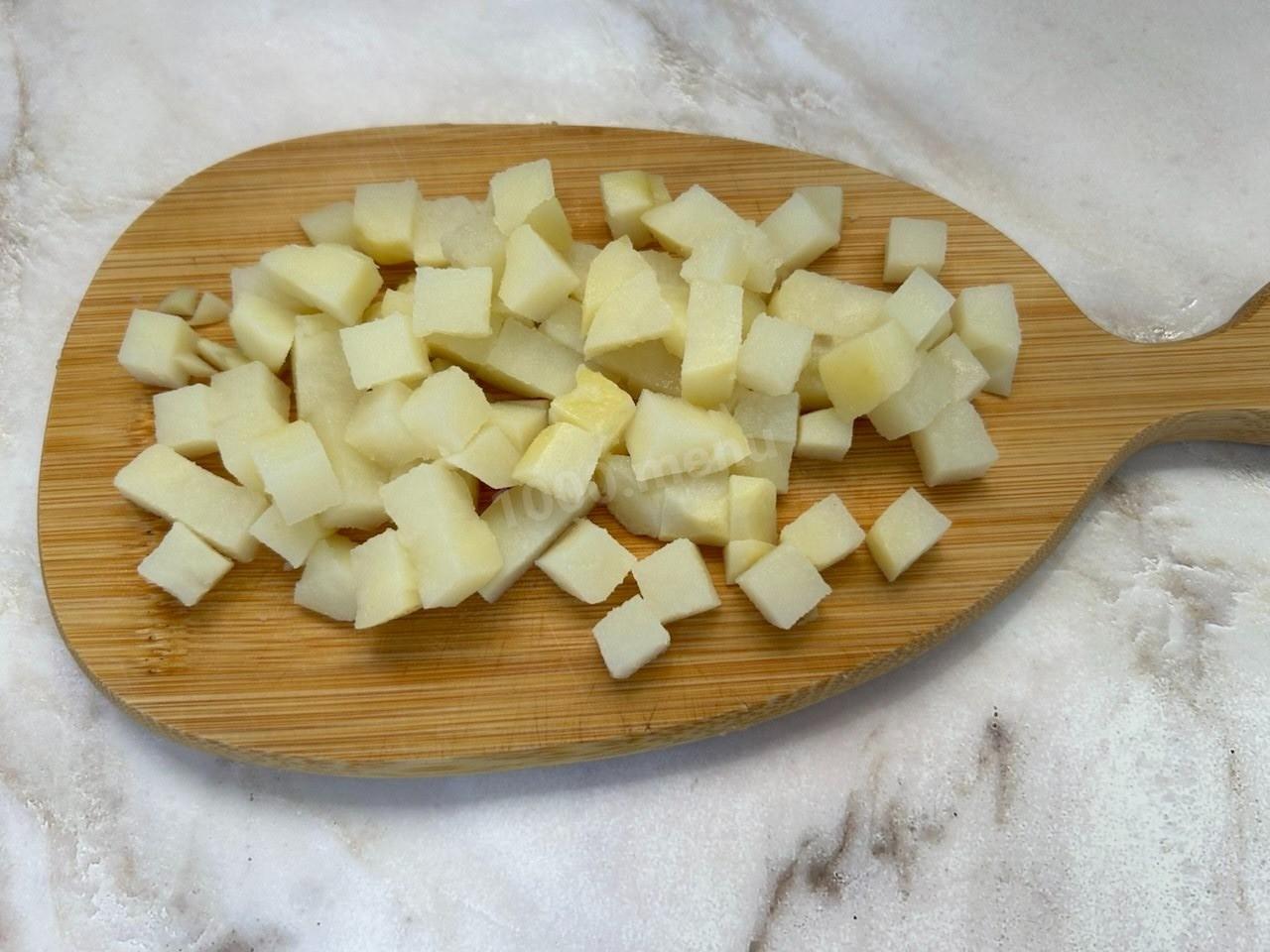 Картофель очистите, промойте и отварите в течение 20-30 минут до готовности. Точное время будет зависеть от размера и сорта картофеля. Подробнее об это читайте в конце рецепта. Готовый картофель нарежьте кубиками.