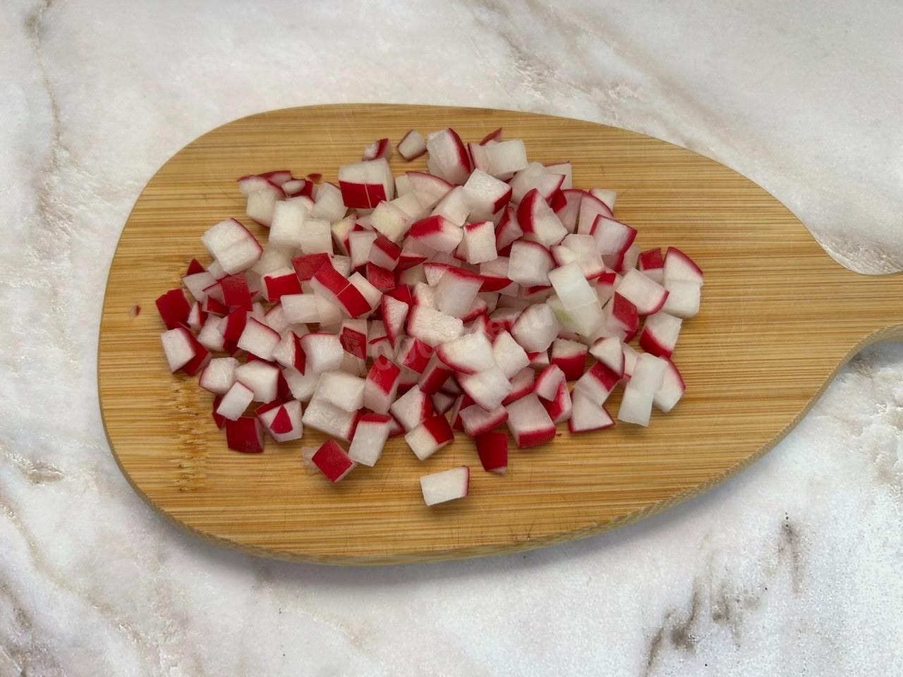Редис также помойте и нарежьте, как огурец.