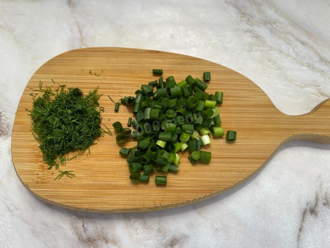 Мелко нарежьте промытые и обсушенные зеленый лук и укроп.