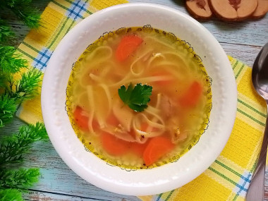 Утром сняла мясо с костей, а бульон процедила. Затем довела его до кипения, выложила мясо и поджаренную морковку. За 10 минут до готовности добавила лапшу и лавровый лист.