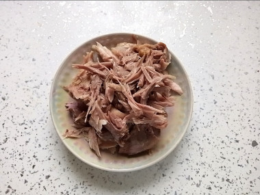 Слегка остывшее мясо курицы отделите от кости и отправьте в суп.