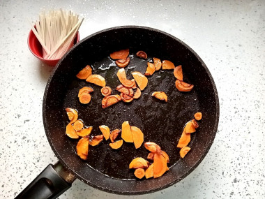 Морковку очистите от кожуры и ополосните. Натрите морковь на крупной тёрке или нарежьте от руки. В сковороде разогрейте небольшое количество растительного масла и обжарьте морковку до золотистого оттенка. Не забывайте перемешивать морковь, чтобы она не пригорела.