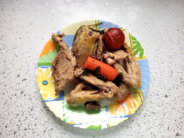 Основную часть сварила вечером, а утром уже довела до готовности. У меня были крылья, шея и спинка от домашнего петуха. Мясо у него темное и жестковатое, поэтому варила все это на медленном огне чуть больше двух часов. Зато бульон получился очень вкусным! Кроме того добавила в него неочищенную луковицу, морковку, петрушку, душистый и черный перец. В конце посолила.
